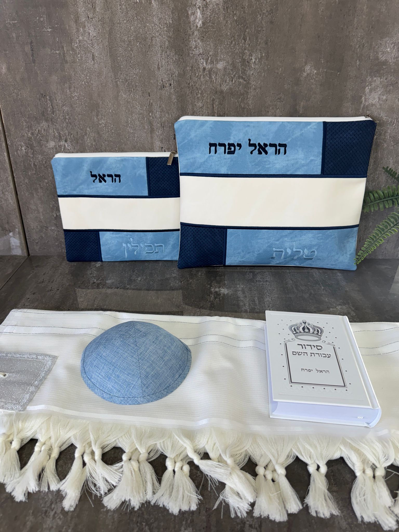 כיסוי לטלית וכיסוי לתפילין מהמם מחולק לגווני כחול תכלת ושמנת.